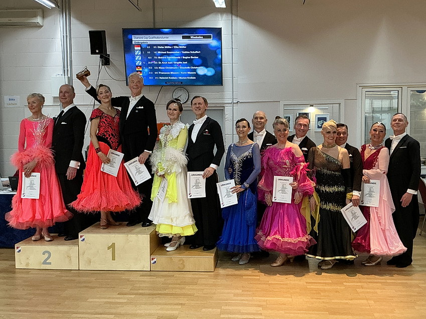 Beim Diamond Cup waren genau 24 Paare am Start, die – nach dem dort üblichen Modus – alle zwei Vorrunden tanzten. Nach Addition der Kreuze wurden dann 14 Paare für das Semifinale ermittelt, aus denen dann aufgrund Platgleichheit sieben Paare für das Finale ermittelt wurden. Davon profitierten Francesco und Karin Misser aus Wolfsburg sowie Heinrich und Marion Kreilein aus Heiligenstadt, die somit am Finale teilnehmen durften, aber dort dann auch die Plätze sechs und sieben belegten. Der achte Platz war allerdings auch nur ein Kreuz von den Finalisten entfernt. Der große Sprung mit 11 Kreuzen Unterschied kam dann zu den Top fünf. Am Ende konnten Dieter und Elke Müller aus Wiesbaden vier von fünf Tänzen und damit auch das Turnier gewinnen. Lediglich der Slowfox ging an Michael und Sabine Saumweber aus Unterpfaffenhofen-Germering, die mit zweiten Plätzen in den übrigen Tänzen folgerichtig auch Platz zwei im Gesamtergebnis belegten. Nach Patz vier im langsamen Walzer verbesserten sich Richard Sonnenwald und Regine Becker in den folgenden Tänzen und damit auch im Finalergebnis auf Platz drei. Der dritte Platz im ersten Tanz ging an Dr. Knut und Brigitte Just aus Unterschleißheim, die im Tango aber auf Platz fünf abrutschten aber in den übrigen Tänzen den vierten Platz belegten, was insgesamt zu einem klaren vierten Platz führte. Auf Platz fünf folgten Klaus und Elisabeth Christmann aus Hannover, die zumindest im Tango einen vierten Platz ertanzten.