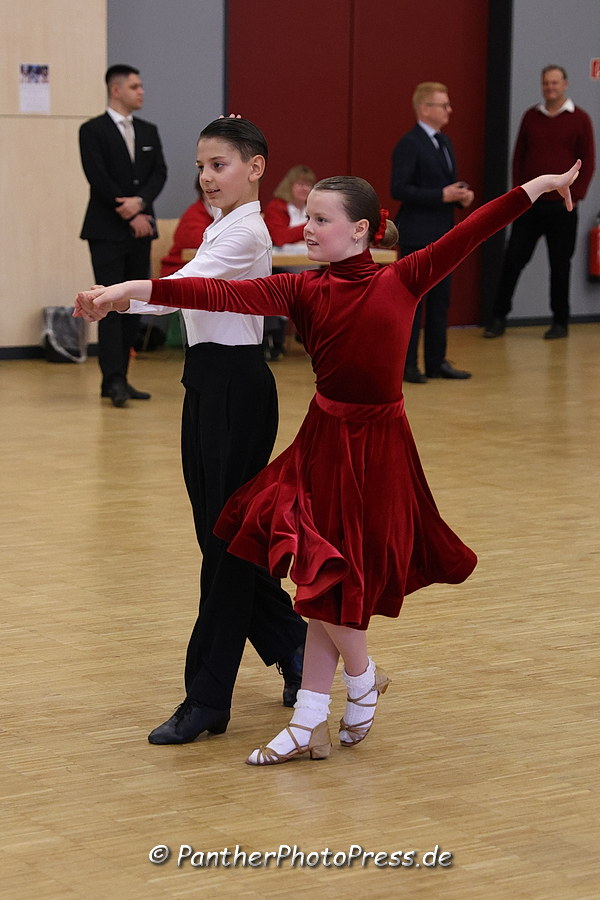 Das Turnier der Kinder D-Latein war eine klare Sache, da die Paare in allen vier Tänzen jeweils denselben Platz belegten. Raphael Alexander Leonhardt und Maria Oberreich aus Frankfurt entschieden Turniersieg und Meistertitel für sich. Dahinter folgten Luca Siefert und Emilia Golan aus Wiesbaden, die mit diesem Erfolg den Aufstieg in die C-Klasse feiern konnten. Platz drei wurde von Leonel und Alina Galwas aus Kassel belegt, die damit das zweite Wiesbadener Paar – Mladenis Naydenov und Charlize Funk – auf Platz vier verweisen konnten.